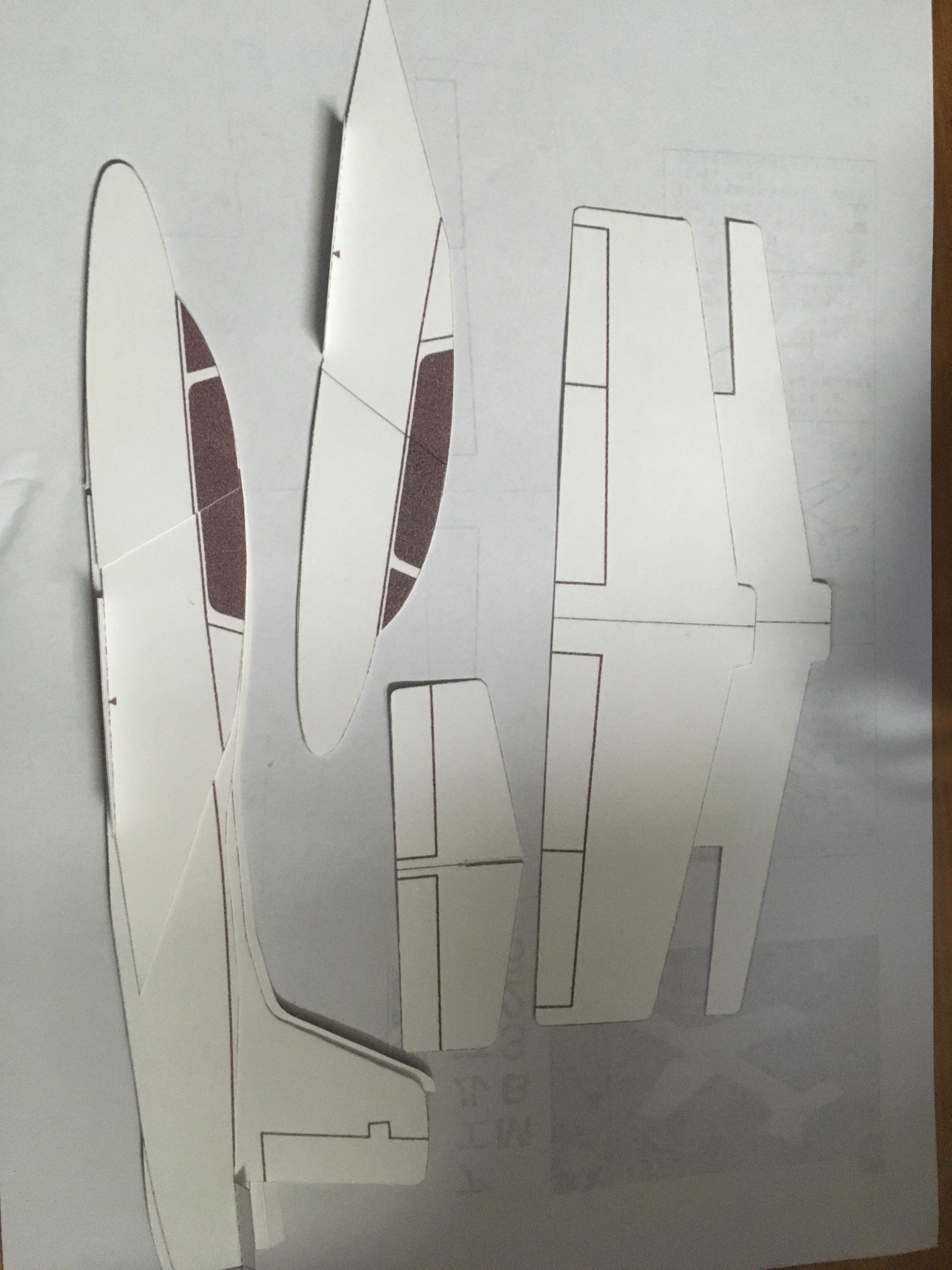 筆者はこの“低翼トレーナー”の改造に着手するにあたり、まず水平尾翼の面積を変えず、もちろん主翼の取付角もいじらずに元の設計のまま、おもりレスにすることに比重を置いてみた。少しでも胴体後部の重量を削るため、中心パーツである①の胴体後部の幅を削った。しかし削りすぎて不安になったため、骨組み代わりの細い紙パーツを①と③の間に貼り付けて補強している。