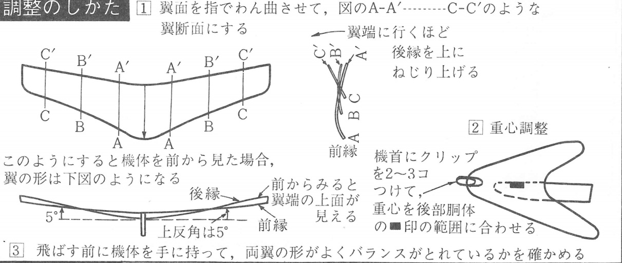 機首が長めの機体が幸いし、前方25%とはいえ重心点調整に限って言えばおもりを用意しなくても充分可能である。しかし“小型 軽飛行機”と同様、厳密にそこに重心点を持っていかなくても飛ばすことが出来る。ふんわり飛ぶことを狙うならば、重心点から3~5mm後方にセットしてやり、飛ばしてみて様子をみることをお勧めする。あんまり後方にするとピッチングがはじまったり、安定性が失われるので、ほどほどに。